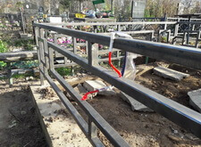 Возвращаемся на могилу. Подготавливаем оградку к покраске, зачищая её от старого покрытия. Параллельно устанавливаем подставку для памятника.